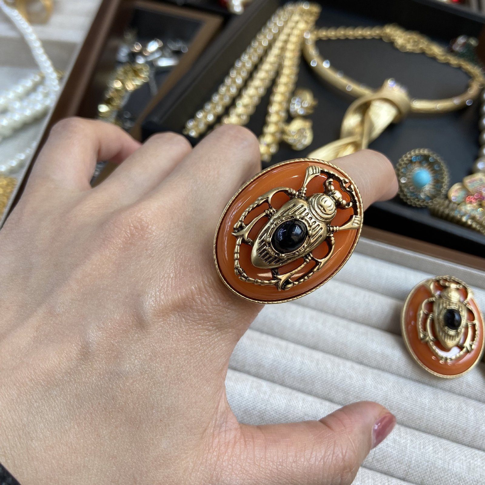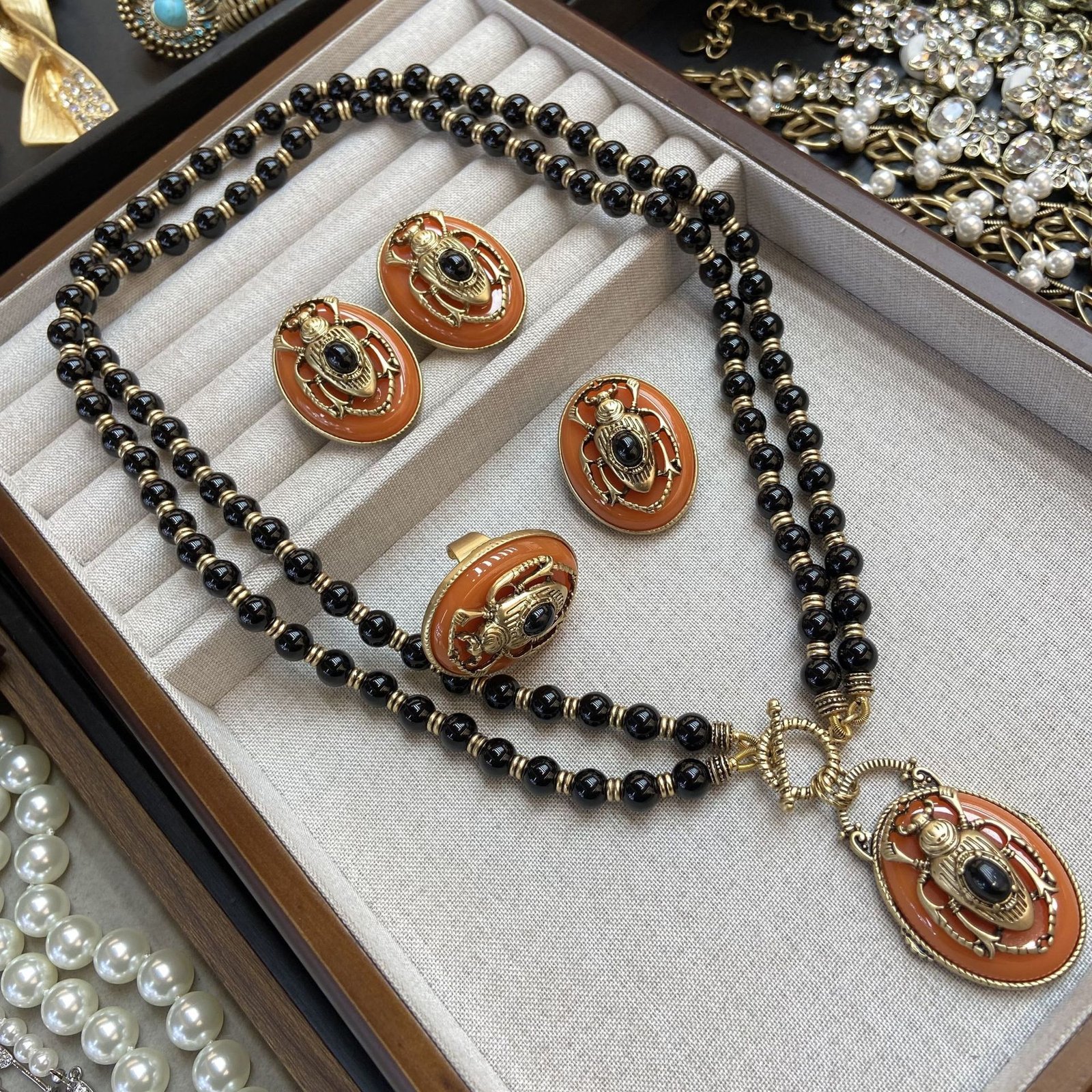 Gold-Plated Enamel Orange Vintage Beetle Insect Beaded Double-Layer Necklace Earrings Ring and Brooch Jewelry Set