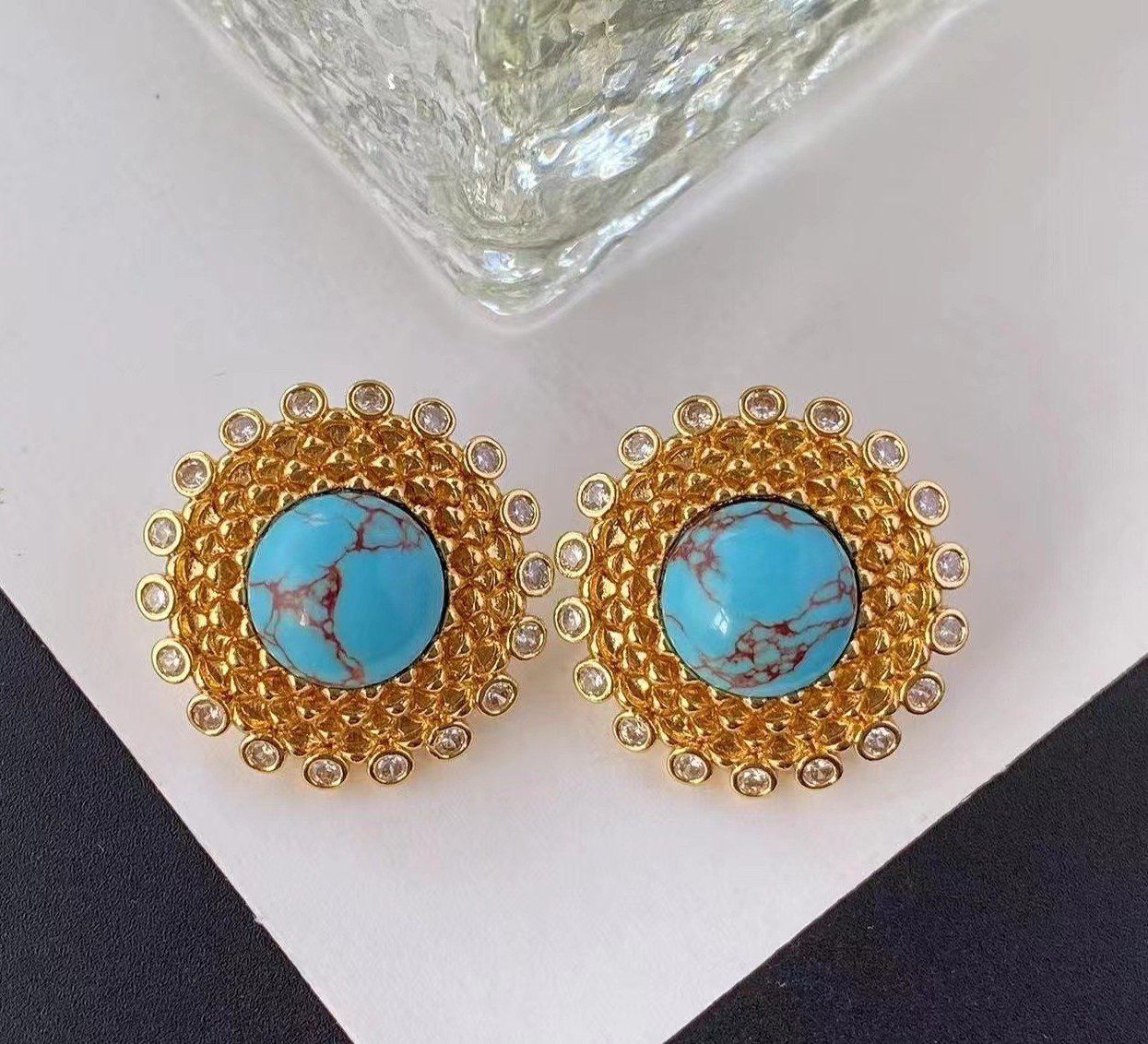 French Vintage Court-Style Round Turquoise Stud Earrings with Zircon Inlay – Gold-Plated Versatile for Work and Everyday Wear Vintage-Inspired Jewelry