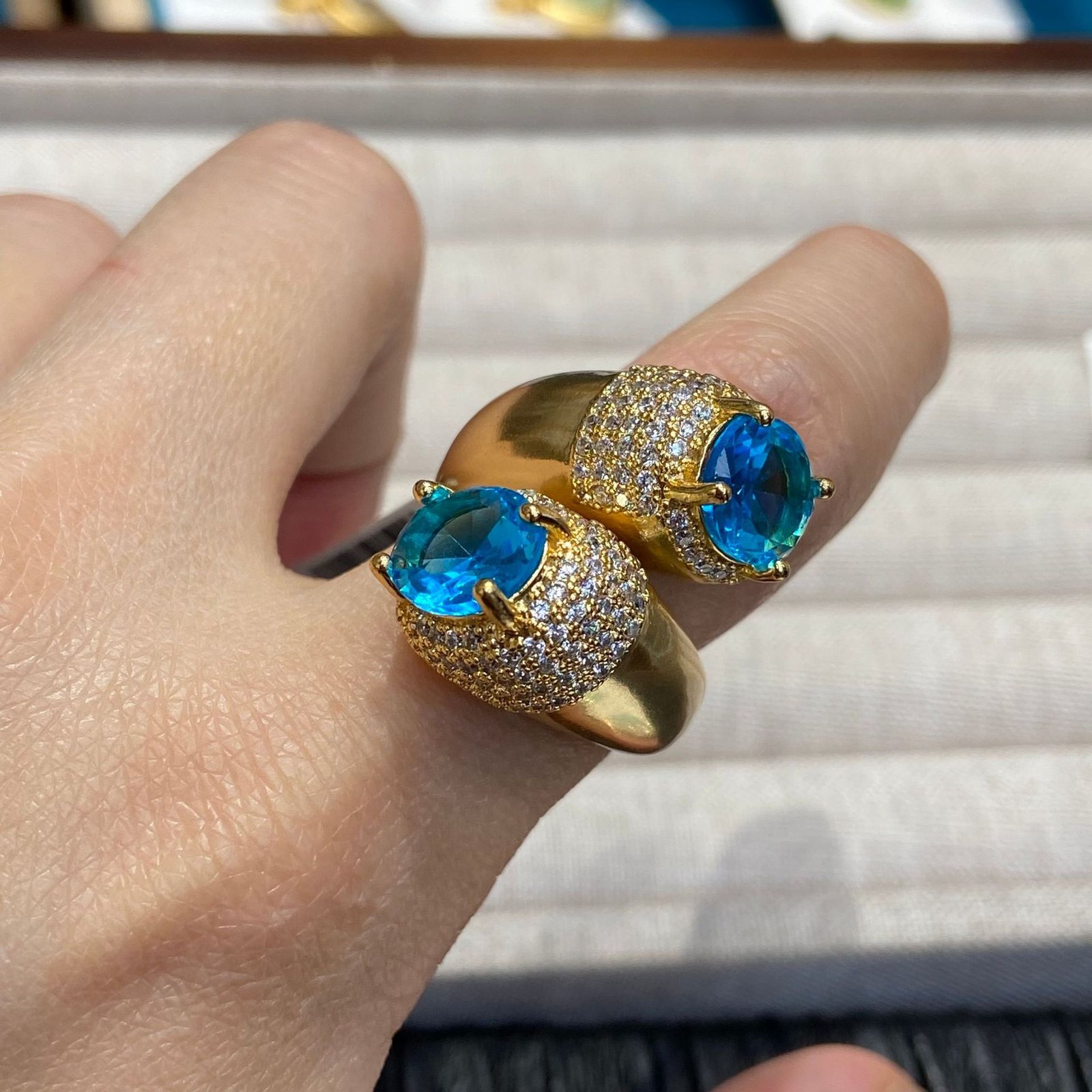 Vintage Gold-Plated Double-Head Open Ring – Blue and Pink Rhinestone Inlay Fully Paved Retro Finger Ring